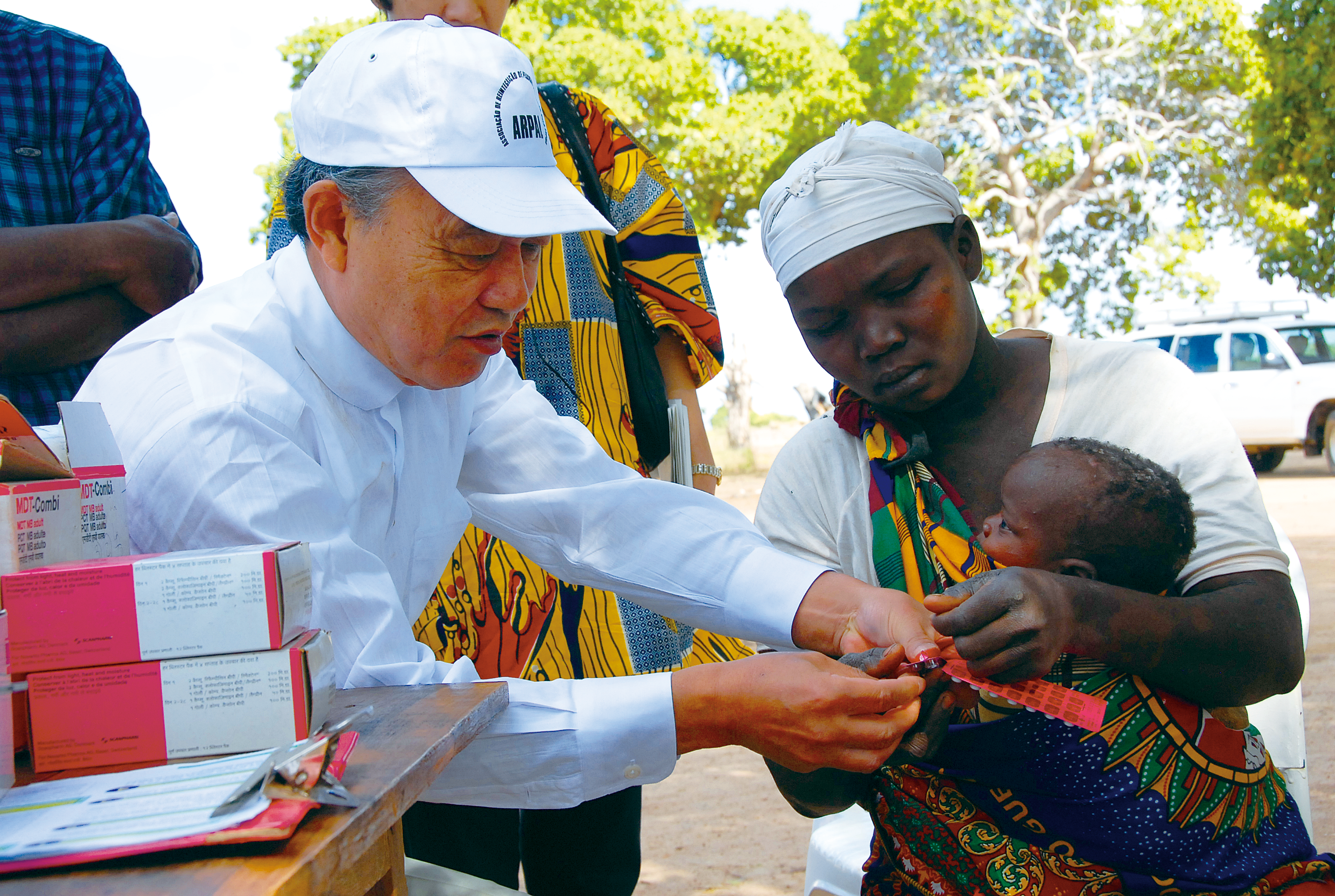 WHO Goodwill Ambassador for Leprosy Elimination, Yohei Sasakawa, teach people how to take their medicines at a health post (City of Mlupula, Mozambique, August 2006)