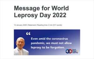 A message from Yohei Sasakawa, WHO Goodwill Ambassador for Leprosy Elimination, has been posted to the World Health Organization’s website. The message emphasizes the importance of early detection and treatment, even amid the COVID-19 pandemic, and the need to confront stigma and discrimination.