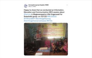 Twitter post by St. Joseph’s Leprosy Hospital (@SJLH_FMMC), located in Mangalore, India, showing their awareness-raising activity supported by a “Don’t forget leprosy” campaign grant.