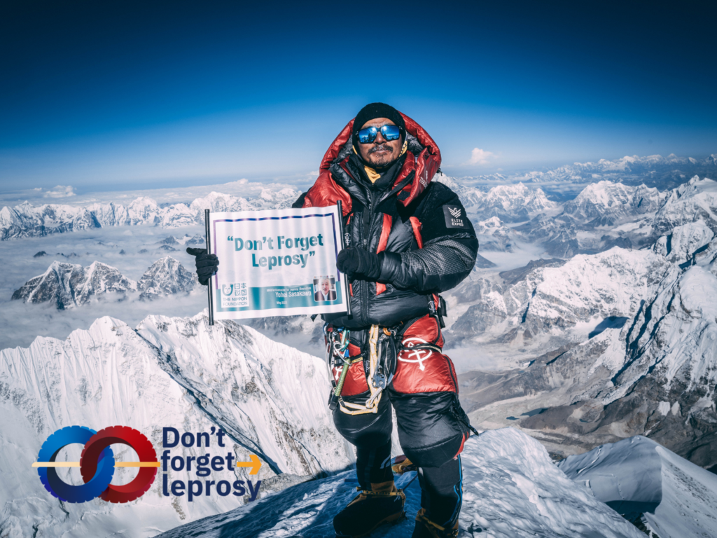 Mingma David Sherpa, Guinness World Record holder and Executive Board Member of Nepal Mountaineering Association (NMA), holding a “Don’t Forget Leprosy” poster on the peak of Mt. Everest, the tallest mountain in the world (8848.86 meters) (May 15, 2022).