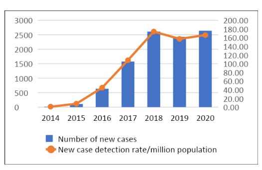 FMOH created a department for NTDs in 2015, and leprosy case detection campaigns were started in camps for internally displaced persons along with mobile skin clinics for the general population. The case detection was strongly backed by intense information, education, and communication campaigns. New cases increased from 14 (2014) to 2,638 (2020). Case detection trends demonstrate the commitment of FMOH to improve leprosy services and to reduce the leprosy burden. The statistics reflect the commitment of the staff and the political commitment and improved coverage of the program and quality of services. The increase in the number of new cases prompted WHO to include Somalia in the list of Global Priority Countries for leprosy and to advocate for more support from partners to the country. Sasakawa Health Foundation (SHF) supported the initiative of FMOH of Somalia to improve the coverage of leprosy services.