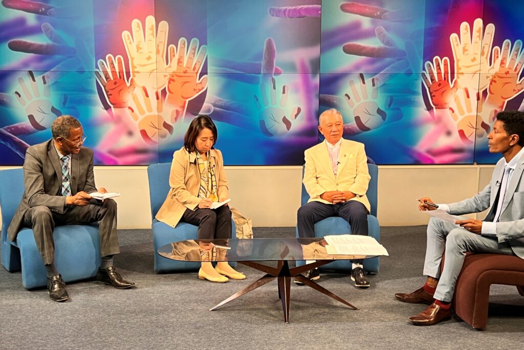 Goodwill Ambassador Sasakawa spoke at a press conference and appeared on an Ethiopian Broadcasting Corporation (EBC) television program. He called for correct knowledge of leprosy and urged households to implement skin checks, especially for children, in order to increase the likelihood of early detection.