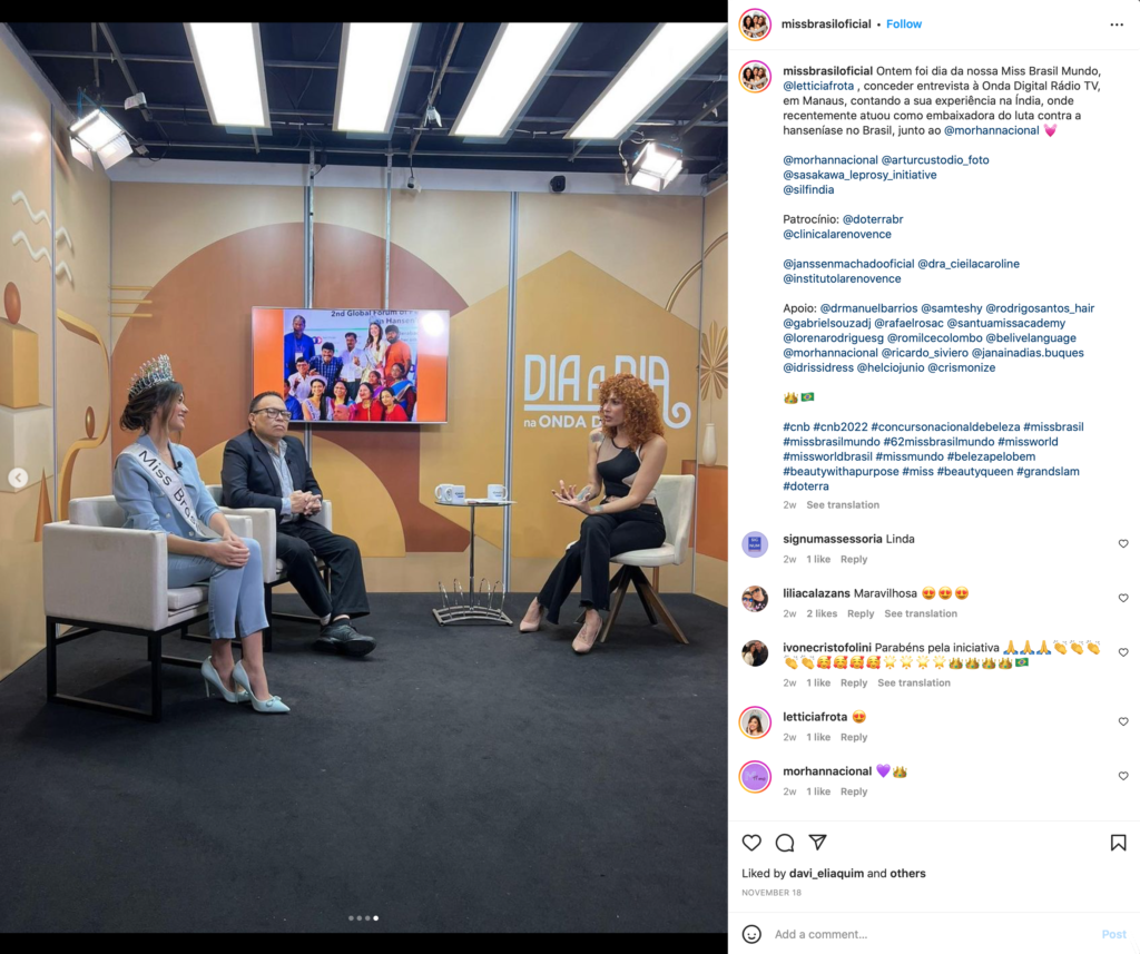 Frota has been an official “Hansen’s Disease Ambassador” for MORHAN since being crowned Miss World Brazil 2022. At the Global Forum, she shared, “This struggle together with MORHAN started 10 years ago, and we have been doing a lot of hard work to be able to give voice to the cause of Hansen’s disease in Brazil.”