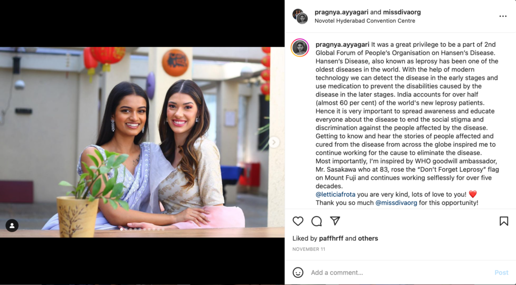 Beauty competitions in India do not have the same history of collaboration with leprosy-related people’s organizations, and so Miss Supranational India 2023 knew only of Mother Teresa’s work for leprosy patients before attending the Global Forum. On the last day of the Forum, Ayyagari shared, “I learned a lot about the disease. I heard all the stories and journeys (of persons affected), how they have been fighting and how COVID-19 has adversely affected the cause because people might have forgotten about Hansen’s disease.”