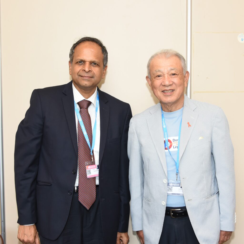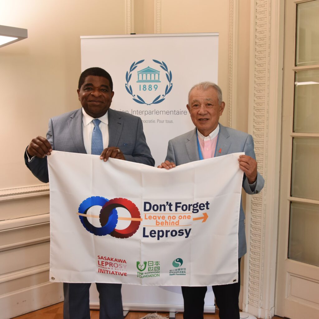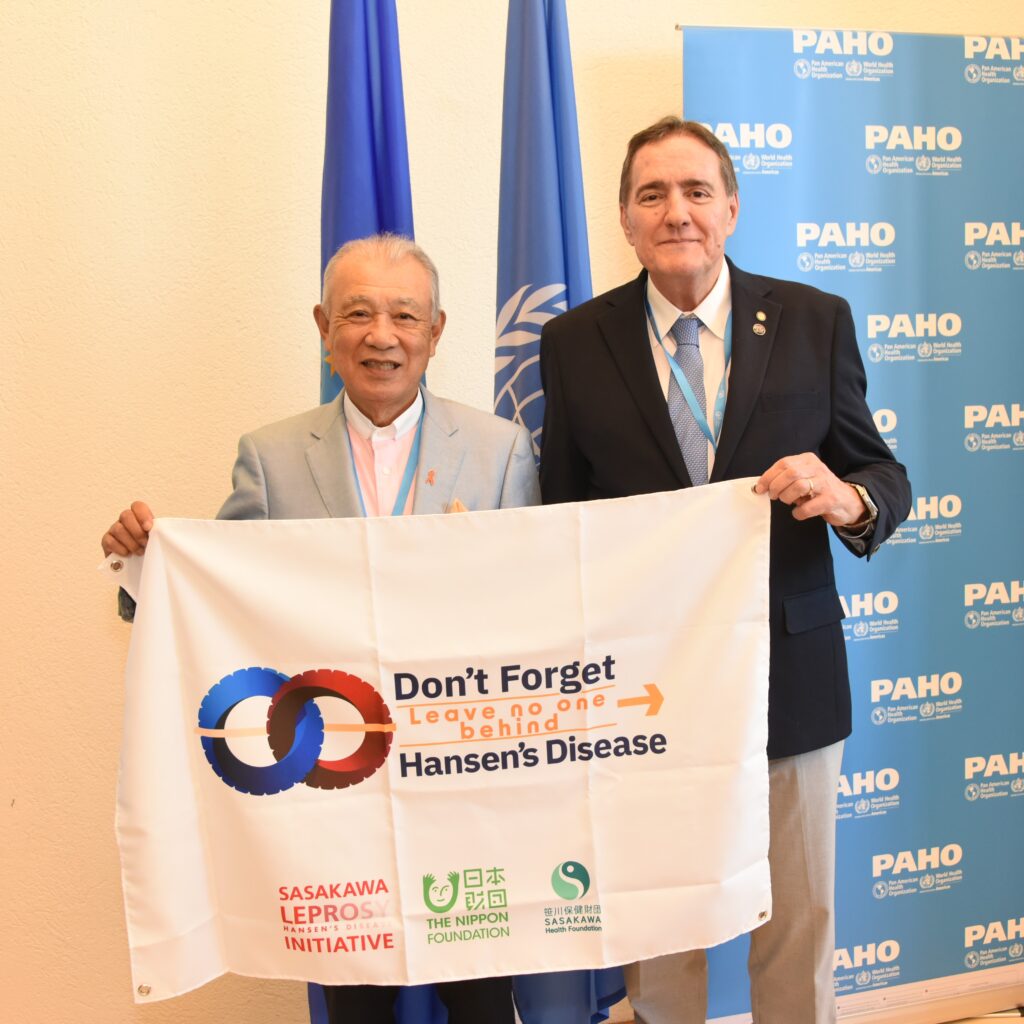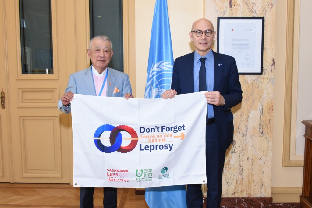 WHO Goodwill Ambassador for Leprosy Elimination Yohei Sasakawa traveled to Geneva, Switzerland, to meet with health leaders from around the world at the 76th World Health Assembly. He listened as leaders described the leprosy situation in their countries, and he asked for their cooperation in achieving a world without the disease and related problems.