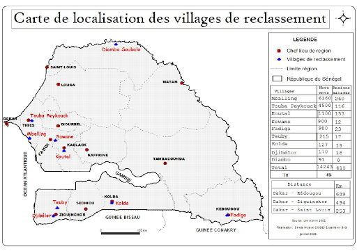 Map showing the locations of Senegal’s nine villages de reclassement social (VRS).