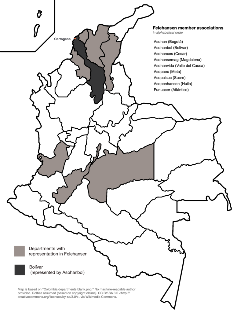 Colombia is divided territorially into a capital district and 32 departments. Nine of these departments have associations of persons affected by leprosy (Hansen’s disease). The associations coordinate their activities through the Federation of Associations of Persons Affected by Hansen’s Disease (Felehansen).