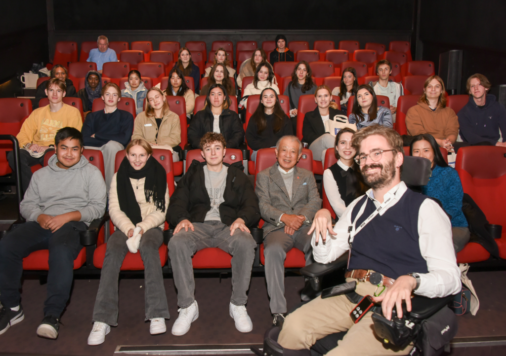 Yohei Sasakawa (front row, fourth from left), WHO Goodwill Ambassador for Leprosy Elimination, and Alexander Petersen (foreground right), a project manager for the Bergen International Film Festival, together with high school students who watched the documentary The Last Mile as part of the School Program.