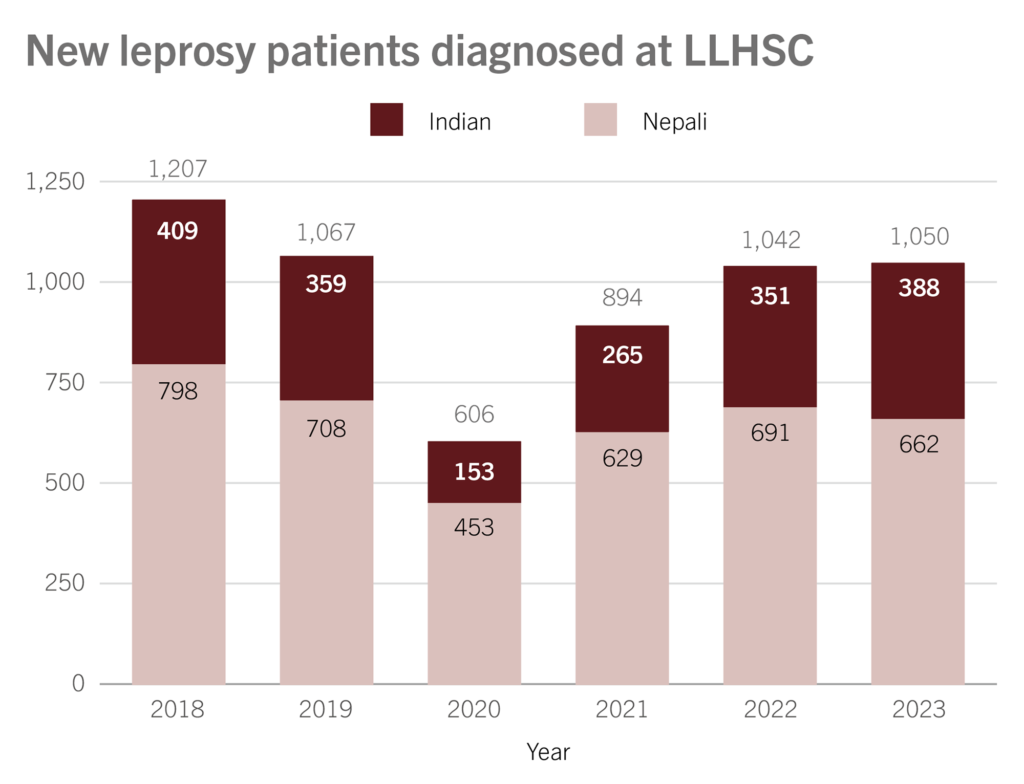 India and Nepal share open borders, allowing their citizens free transit between the two nations. This freedom is utilized for various purposes including seeking medical treatment. Many Indians, in particular, travel to Nepal for leprosy treatment, primarily at the Nepal Leprosy Trust (NLT)/Lalgadh Leprosy Hospital and Services Centre (LLHSC). Roughly 34% of new leprosy patients diagnosed at LLHSC are Indian, and so are 23% of the hospital’s annual in-patient admissions. These patients typically stay for three to six months. All services related to leprosy treatment at the hospital are offered free of charge, irrespective of the patient’s race, caste, gender, or nationality.