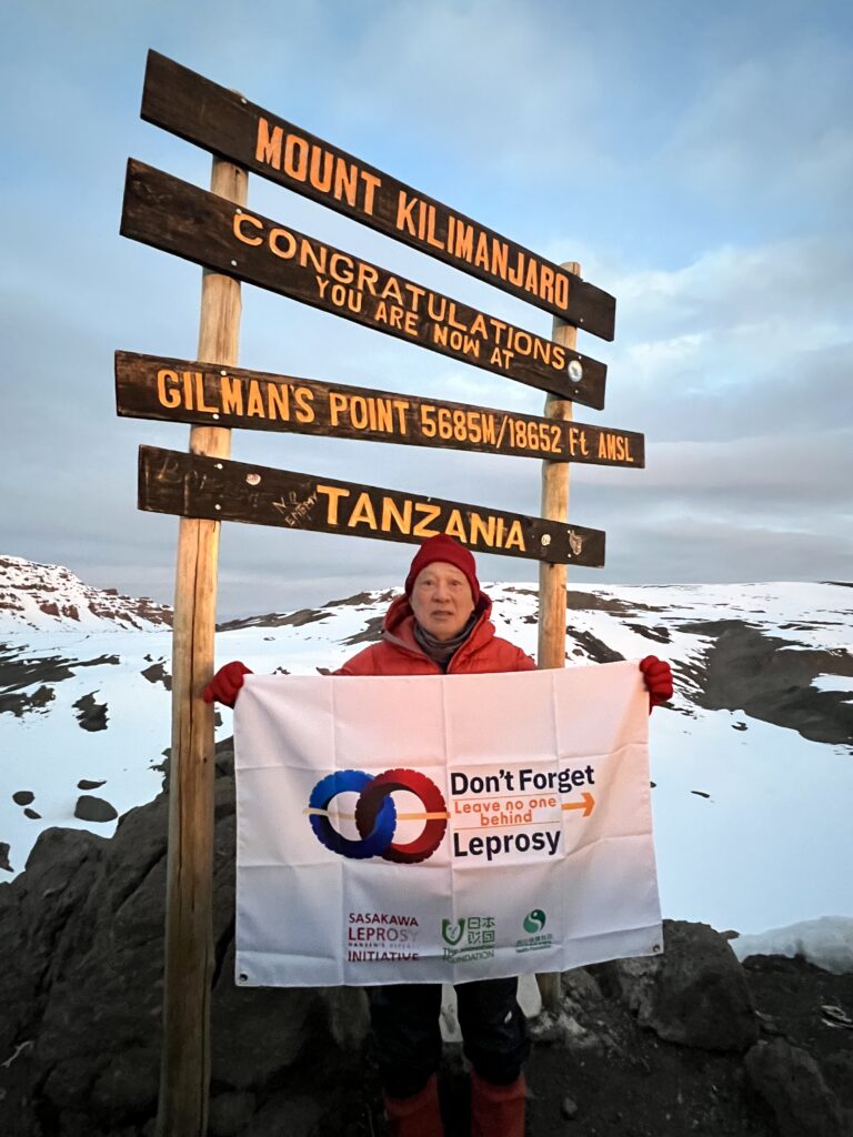 Battling low oxygen levels and cold temperatures, the Goodwill Ambassador began the final leg of the ascent in the middle of the night. On Feb. 12, 2024, just before dawn, he reached Gilman’s Point (5685 meters), one of Mt. Kilimanjaro’s three summits. Amid rock and snow, he spread the “Don’t Forget Leprosy” banner in a message to the world.