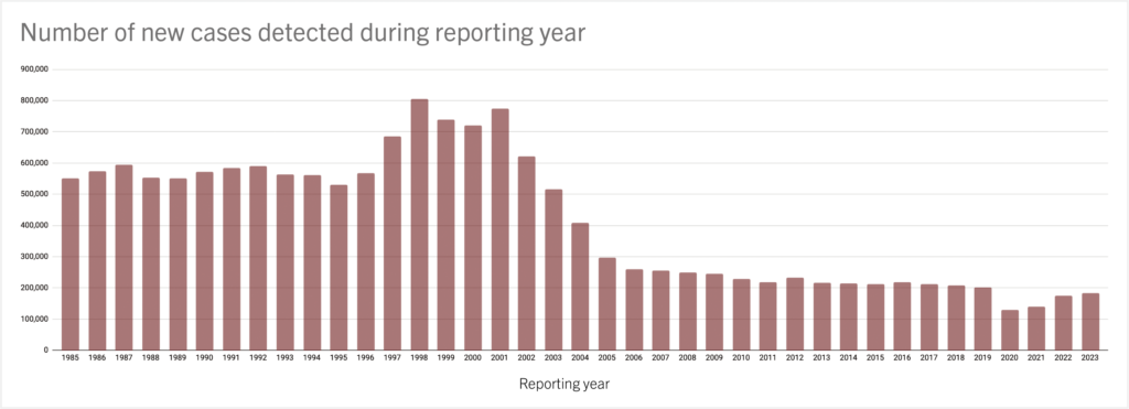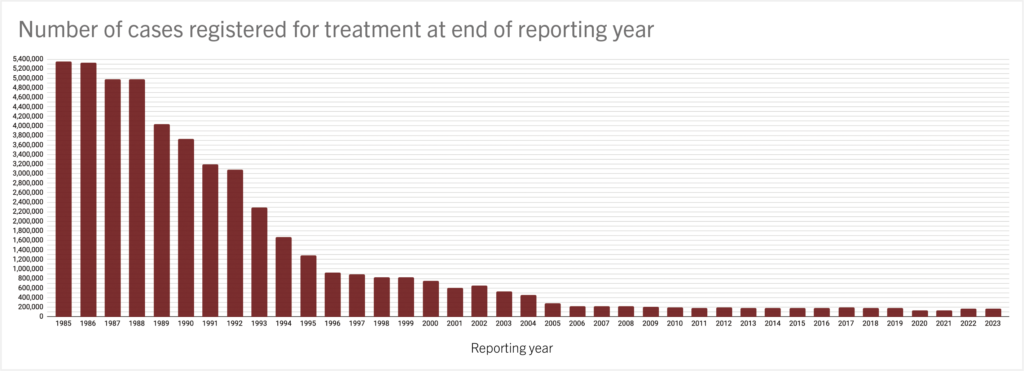 Novartis has been committed to eliminating leprosy for decades, with our multidrug therapy (MDT) as a cornerstone in treating approximately 18 million patients since 1981. Prior to the 1980s, leprosy affected millions of people. However, worldwide introduction of freely available MDT – supported in no small part by The Nippon Foundation (TNF) – marked the start of a massive downward shift in the number of patients. The global MDT donation model funded by TNF and facilitated by the World Health Organization (WHO) from 1995 to 1999 paved the way for Novartis to continue to manufacture and donate MDT in the years that followed, and we continue to donate MDT worldwide via WHO today. Ultimately, the global prevalence of the disease has fallen by over 95% in the past four decades; yet, we have now reached a plateau.